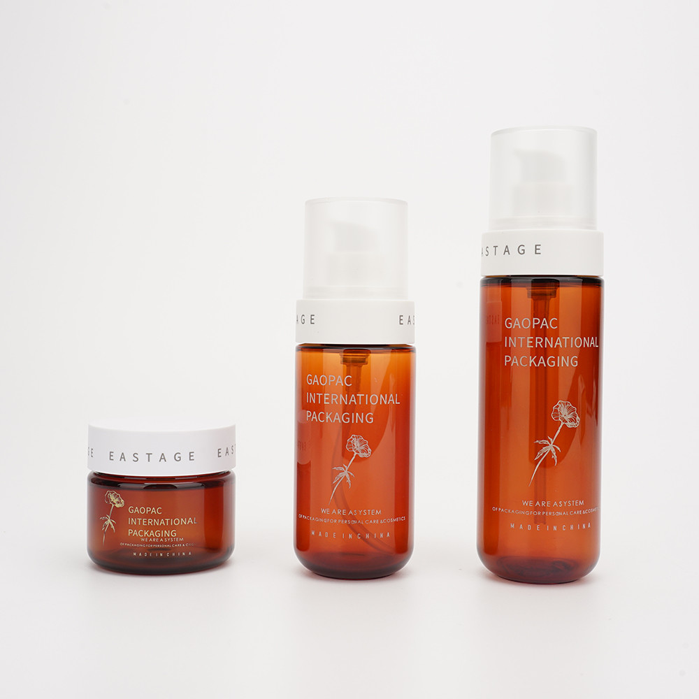 3 زجاجات فارغة من منتجات العناية بالبشرة.تصميم بسيط ، جسم زجاجة العنبر بغطاء أبيض.متعدد المواصفات ، بما في ذلك وعاء الكريم وزجاجات اللوشن.يمكن إعادة تدويرها.